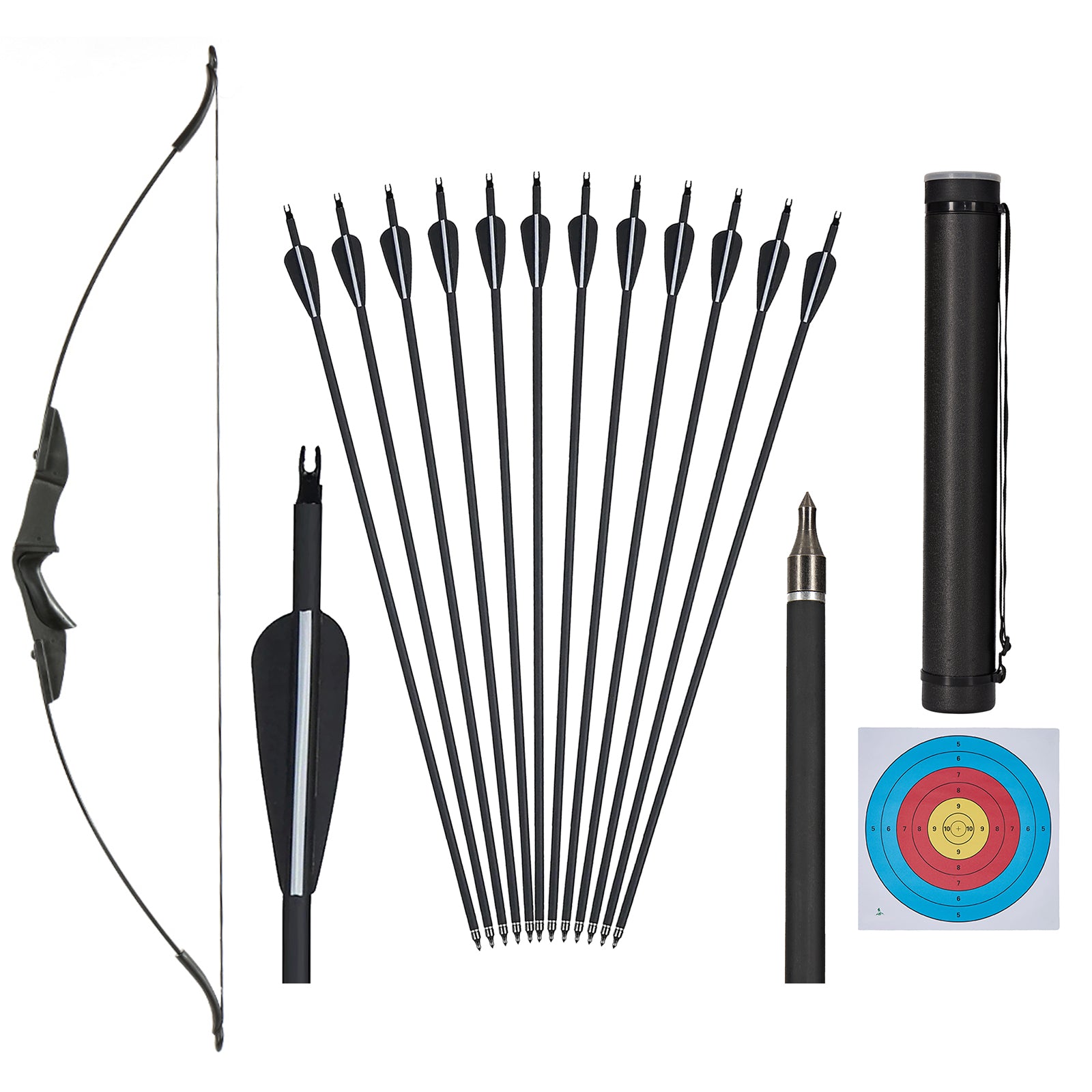 • Das Set enthält einen Recurve-Bogen, 12 x 31,5" Pfeile aus gemischtem Carbon, 1 x Teleskopköcher, 1 x Zielscheibe.