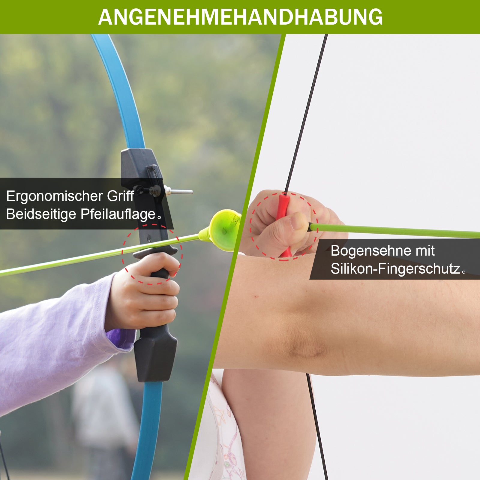 Das ideale Bogenschießset für Anfänger und Kinder. Mit beidhändigem Bogenhandgriff, geeignet für Rechts- und Linkshänder. Einfache Montage für schnellen Lernerfolg. Perfekt für Familienspaß im Freien oder im Garten. Bitte unter Aufsicht der Eltern zusammenbauen und verwenden.